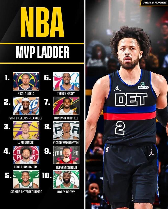 NBA官方公布的最新一期MVP排名當(dāng)中,約基奇、亞歷山大、東契奇穩(wěn)居前三,而排在第四的球員從字母哥變成了坎寧安。